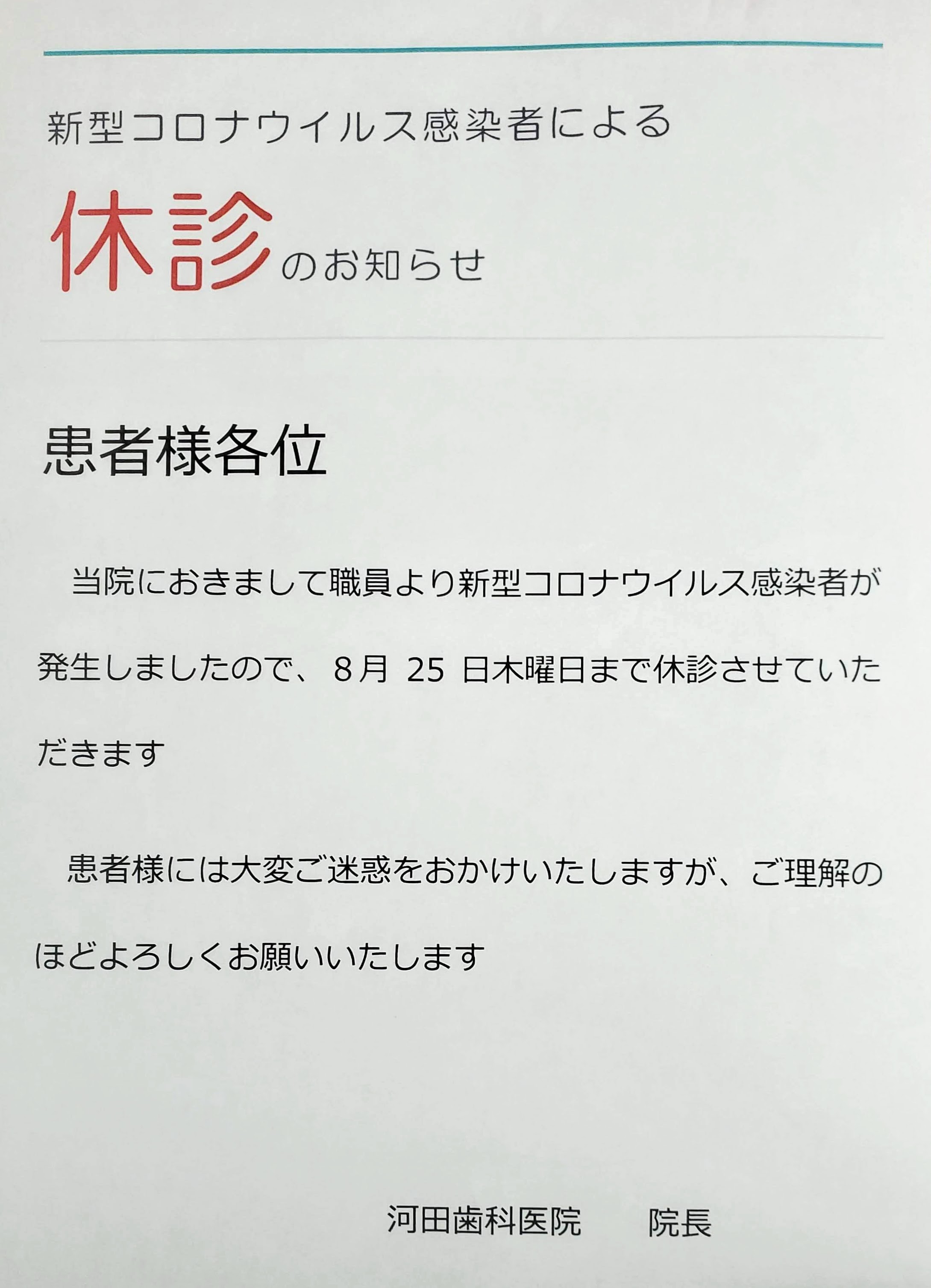 当院におきまして職員より新型コロナウイルス感染者が発生しましたので、8月25日木曜日まで休診させていただきます