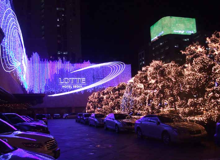 ホテルはミョンドンのロッテホテル。今回はショッピングが中心なのでロッテホテルを指名したツアーです。なるほどショッピングには最高の立地でした。クリスマスシーズンということでロッテホテルのイルミネーションはとってもキレイでした