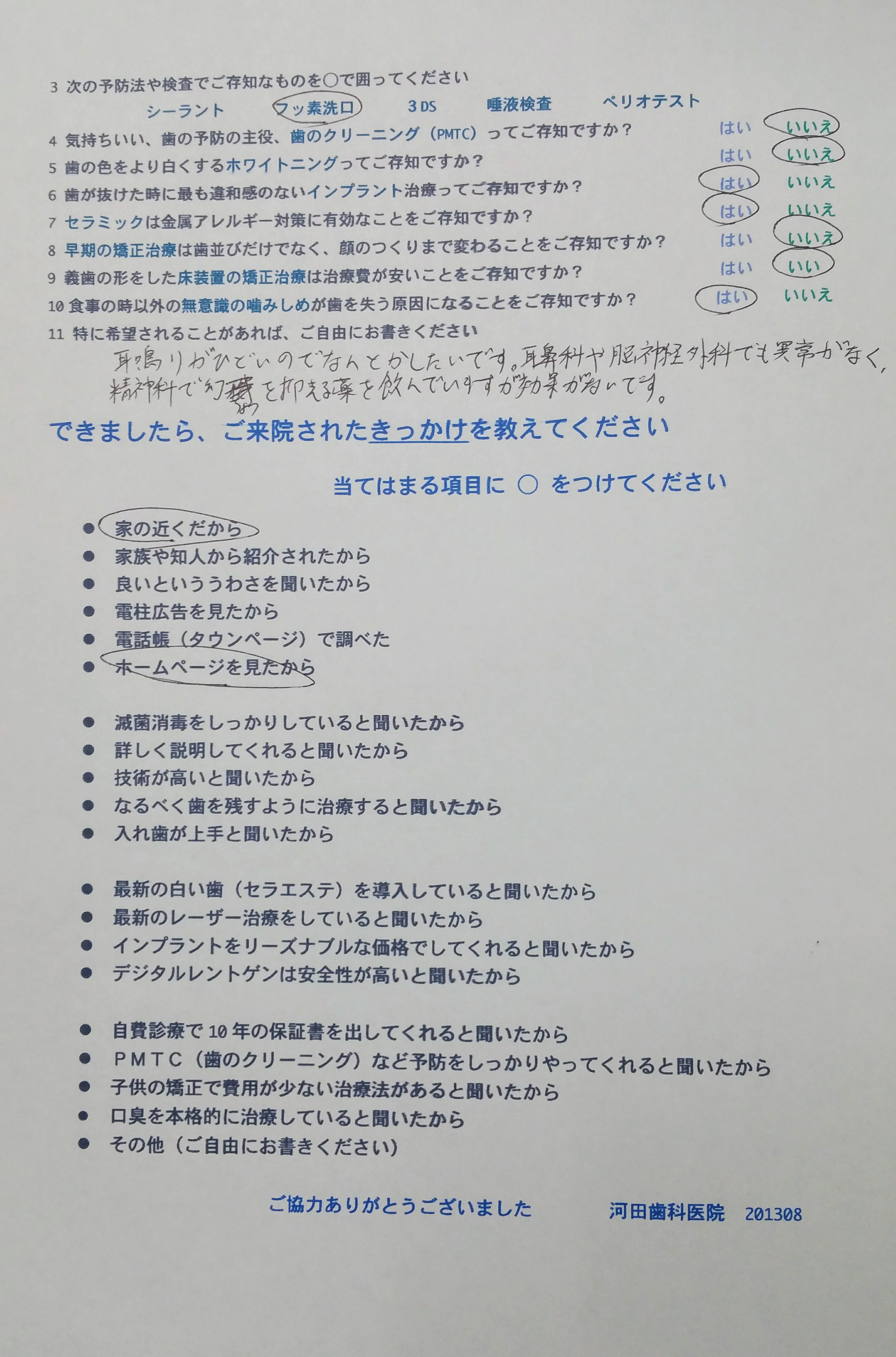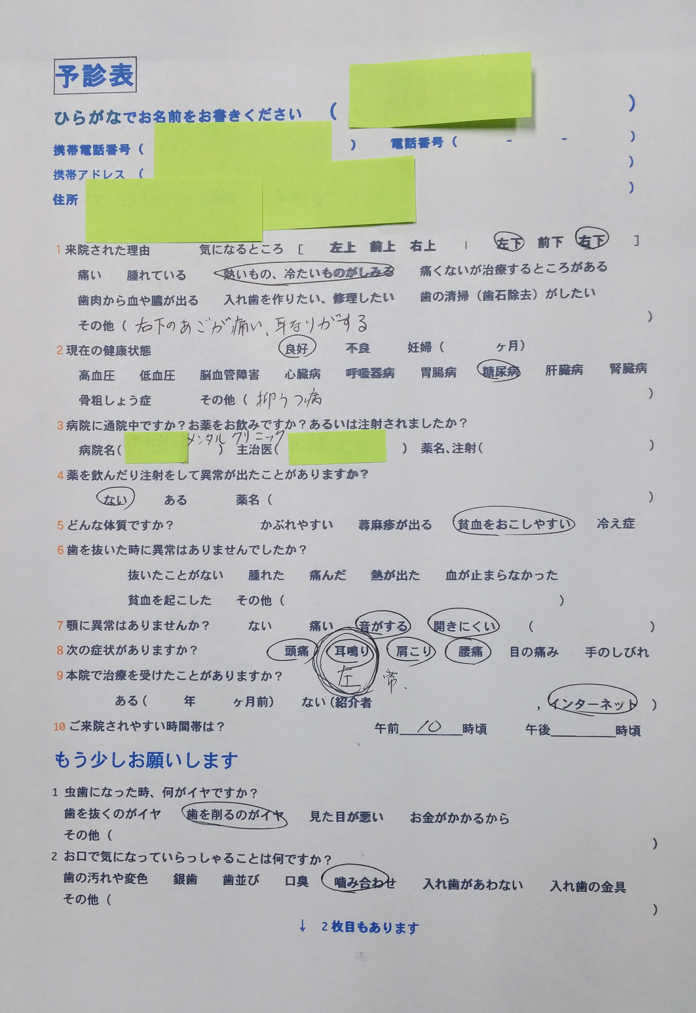 30代男性で予診票にあるように、右の下顎の痛みと左耳鳴りがひどくて頭痛、肩こり、腰痛もあり、多くの歯科医院や神経科にも通院されてきたそうで、10年以上病んでおられ糖尿病などの全身疾患も併発されています