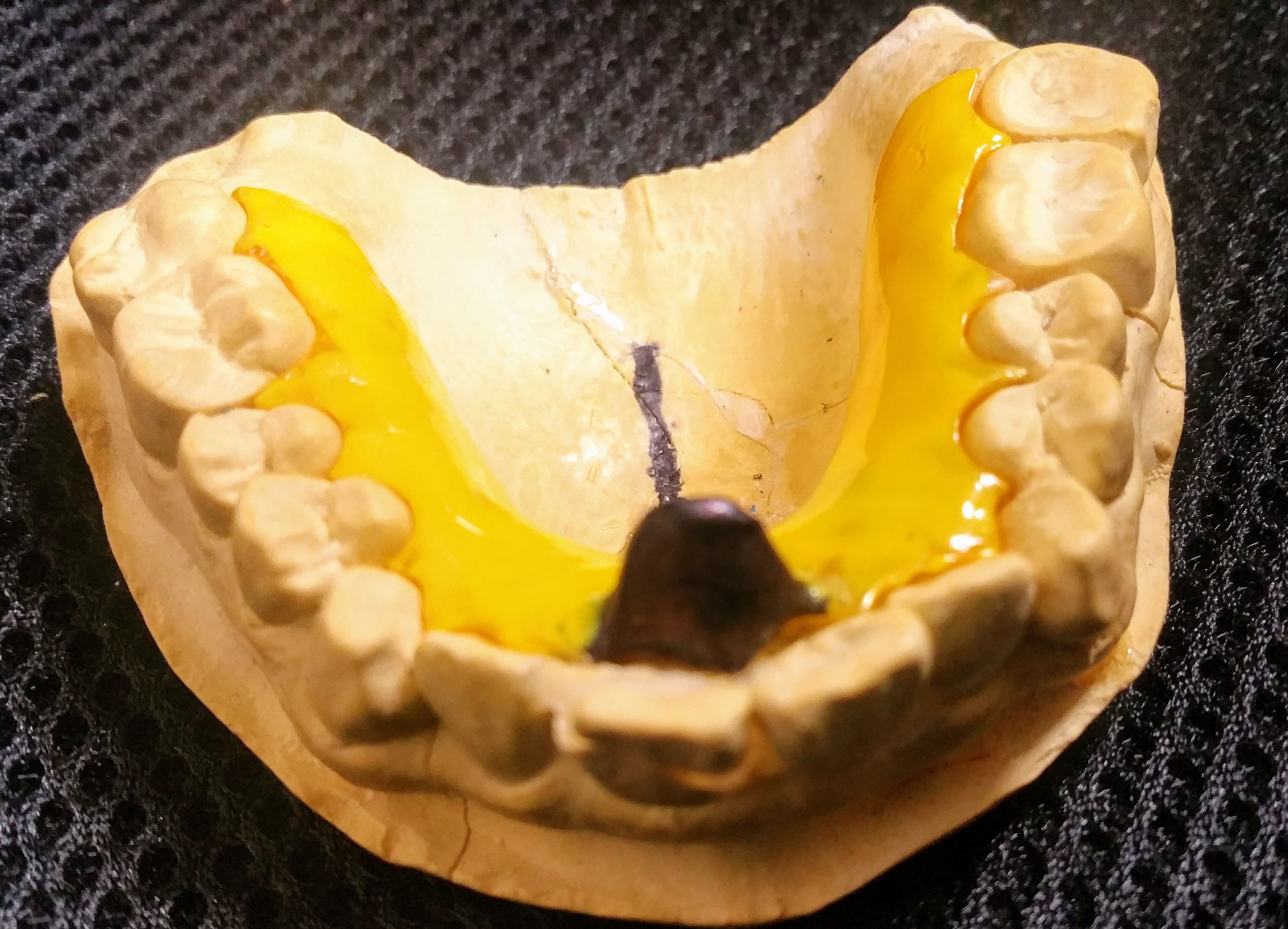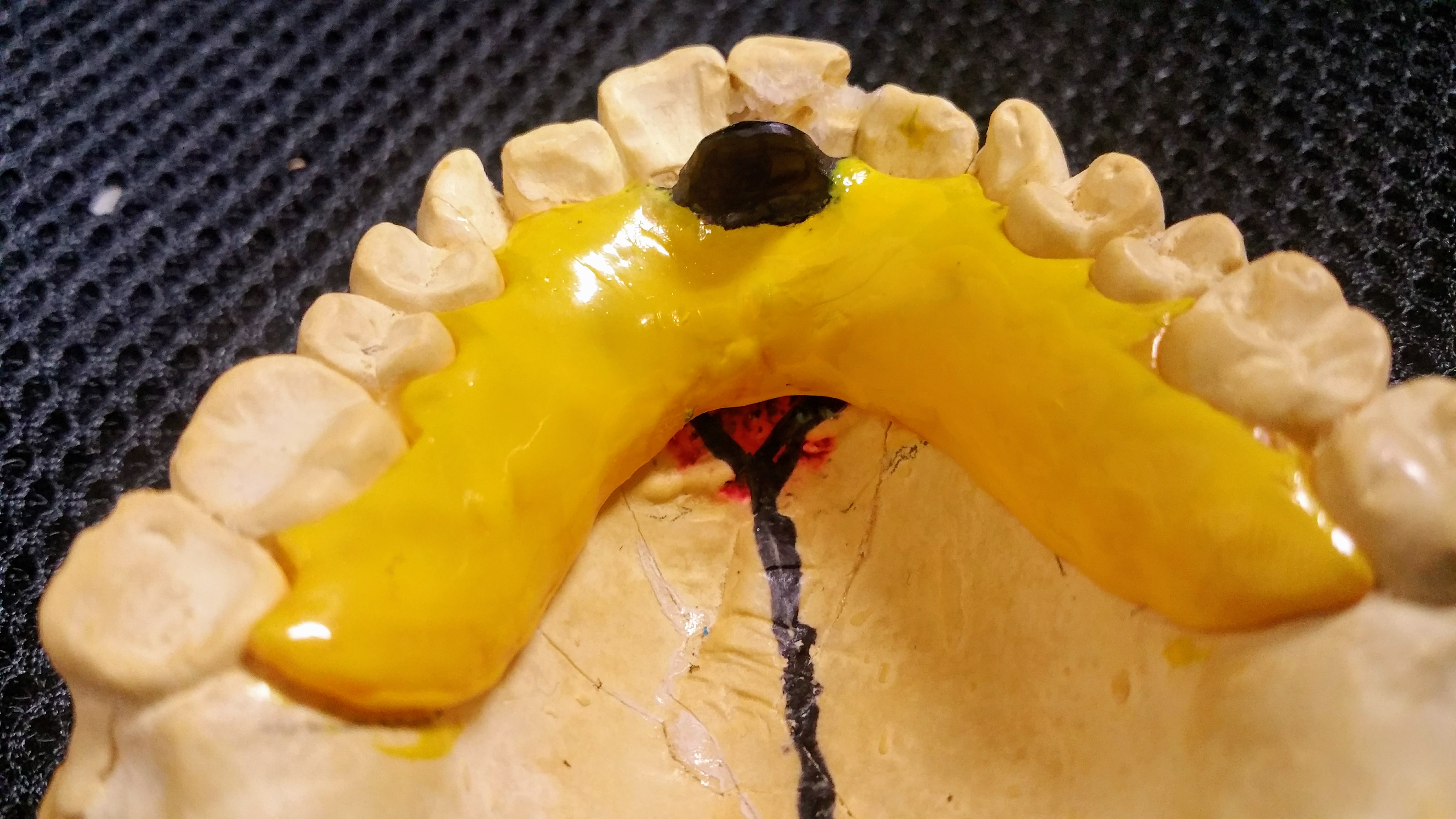 できるだけ切歯乳頭付近で、下顎前歯に当たらない位置から